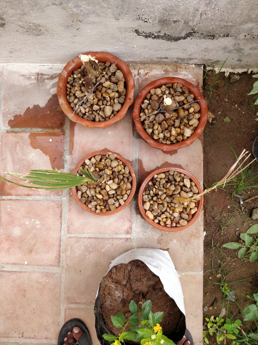 I had Cocopeat, Vermicompost, Redsand in my garding kit. Also we had good clay soil in my house and we used it. Vaigai river flows right behind my community and we were able to get river rocks from there.